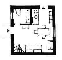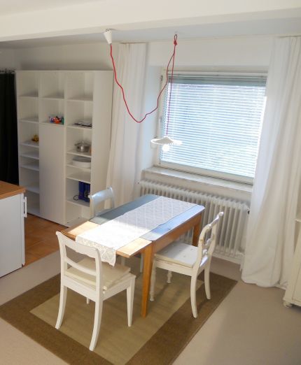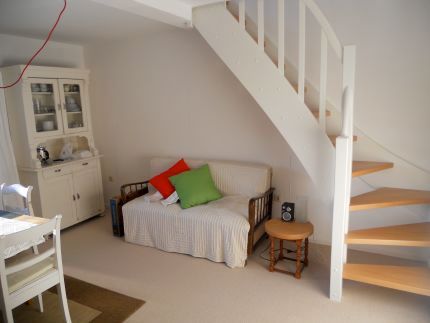 Die Treppe führt zum großzügig ausgebauten, hellen Studio, das als multifunktionaler Raum zum gemütlichen Beisammensein, lesen, fernsehen und Musik hören dient. Zum Schlafen wird das moderne und sehr bequeme Sofa ausgezogen.